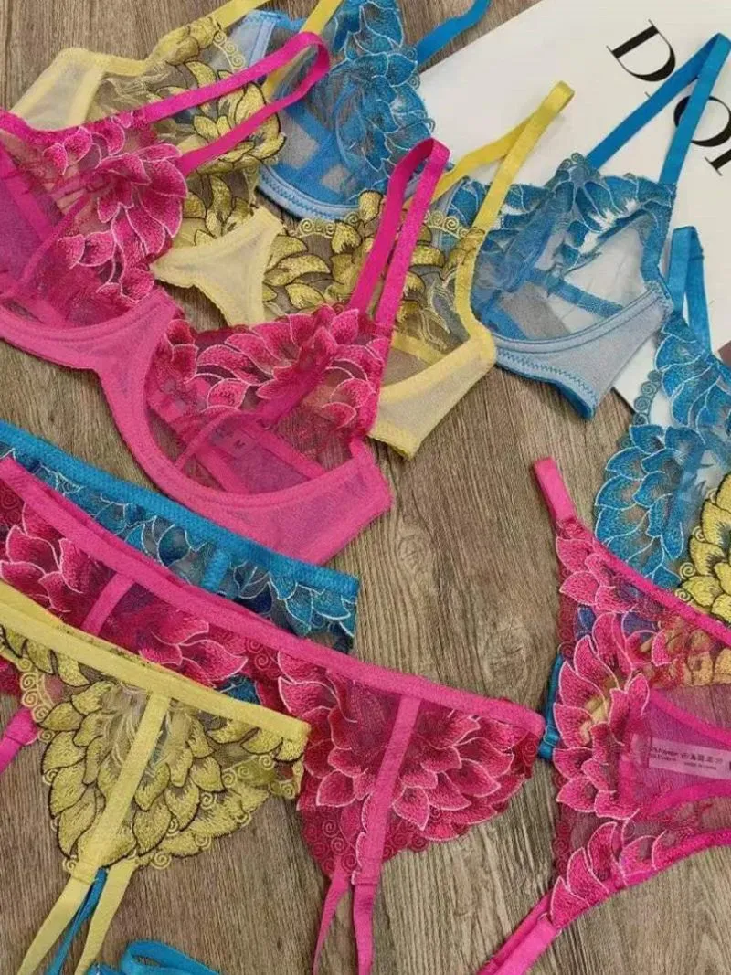 The set comes with a matching top, stylish panty, and a decorative suspender belt, making it both practical and stylish. Available in Rose Red, Yellow, and Blue, and in sizes S to XL, it’s perfect for everyday wear or special occasions.