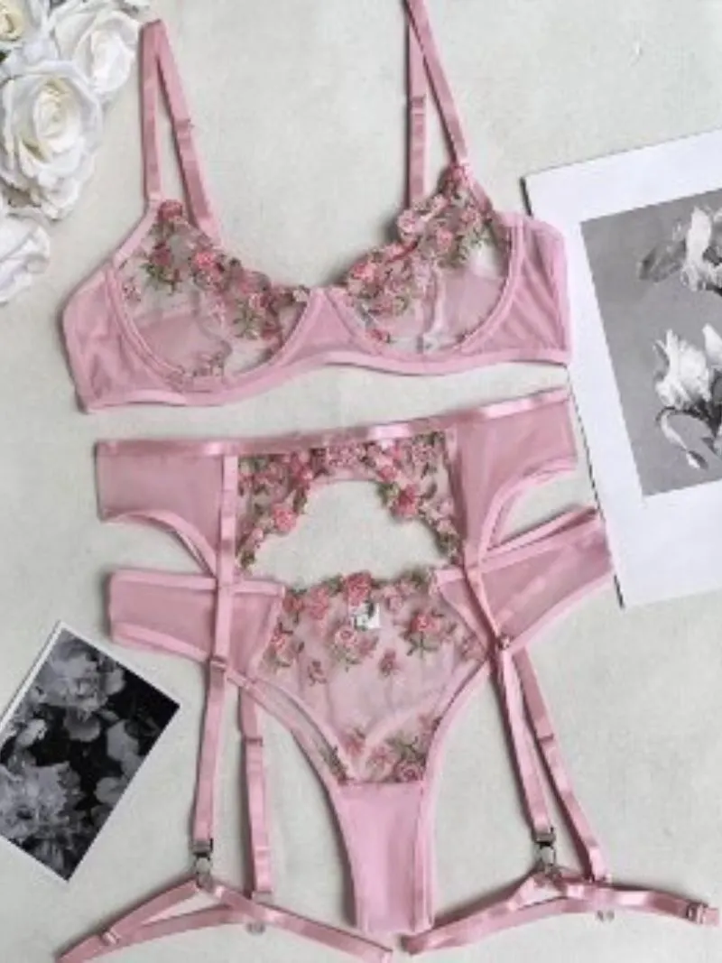 Fleur Sheer Embroidered Lingerie Set – Balconette Bra, Thong & Suspender Belt | Pink Mix